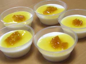 杏仁豆腐が固まったら、マンゴーとソースをトッピングして出来上がりー。