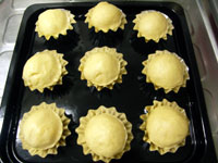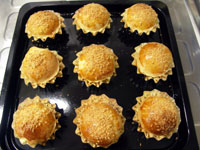 溶き卵を表面に塗って、キャラメルクランチを上に乗っけて180度のオーブンで15分焼くと出来上がり。