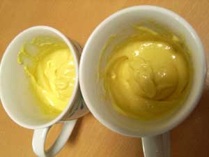 2つのカップに粉を半分ずつ入れて、牛乳大さじ3杯入れて、お箸でぐるぐる練る。