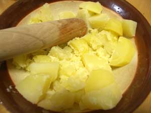 柔らかくなったら、すりつぶす。で、片栗粉を入れて練る。