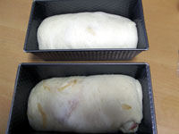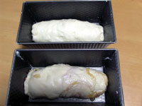 レシピには、「生地が型の高さより少し出るくらいまで発酵させる」って記載されているのだけど、我が家の型は大きすぎるためこんなもの。