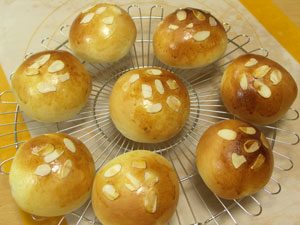 発酵後、溶き卵を塗って、スライスアーモンドを乗せます。あっ! そうそう、このアーモンドスライスはキットに含まれません。あんパンにはケシの実の方がGOODな感じだったのだけど、我が家にはなかったのでアーモンドスライスとなりました。