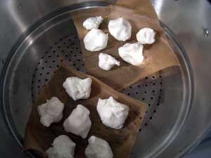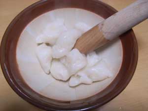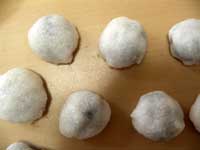 「もちを手のひらで平らにのばして、餡を包み込む」って書いてるけど、どうがんばってもうまくいかない。もちが堅すぎでまとまらなーい。