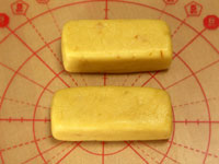 オレンジピールスライスを細かく刻んで、ココナッツファインとバター、卵黄、ミックス粉を混ぜてまとめて、2等分する。